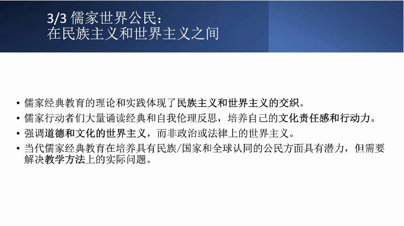 当代儒家教育并非只有单向度的文化民族主义色彩。尽管许多教育行动确实以传统文化复兴为出发点,并在批判现代教育体制时体现出鲜明的文化政治立场,但若回到更长时段的思想史脉络,儒家内部同样存在天下意识、普遍主义取向以及能够与世界主义相互对话的思想资源。由此,“儒家公民”并不只能被理解为面向内部文化认同的主体,也可能包含面向更广阔世界的价值想象。