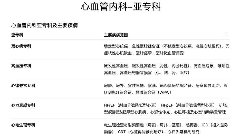 基于功能障碍的不同类型,临床上通常将心血管内科划分为多个亚专科:冠心病组处理心绞痛与急性心肌梗死,主要病因为冠状动脉粥样硬化导致的血管狭窄或堵塞;高血压专科关注原发性血压升高及由肾脏或大血管狭窄引起的继发性高血压;心律失常领域处理房颤、室速等节律紊乱,关系到是否需要射频消融或起搏器植入;心力衰竭则位于疾病进展的终末阶段,无论病因为何,泵血能力下降最终均归结为左心衰竭或右心衰竭。