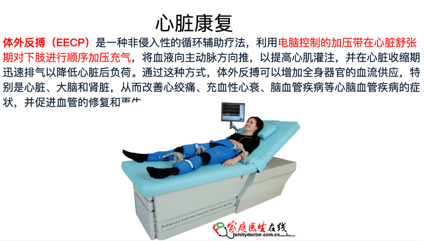 传统的心脏康复方式包括监测下的功率自行车训练,通过逐步加重阻力评估心肺耐力极限,在运动负荷过程中实时监控心电、血压、血氧等参数,以便为患者建立个体化运动曲线。除运动康复外,体外反搏(EECP)被归为无创循环辅助疗法,在国内多数医院设置于心脏康复科。该技术通过在下肢缠绕气囊,在心脏舒张期依次加压,将下肢静脉血挤压回心脏,从而增加冠状动脉灌注压力;在心脏收缩期快速泄压,以降低外周阻力,减轻心脏负荷,实现“增流”与“卸压”的双重效果。
